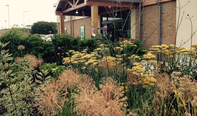 Commercial site, Ludlow A new take on car park planting, I devised a scheme of planting for the area surrounding the store that uses perennials to give a changing palette of planting through the year. Even in winter, the seedheads and grasses are great to look at.