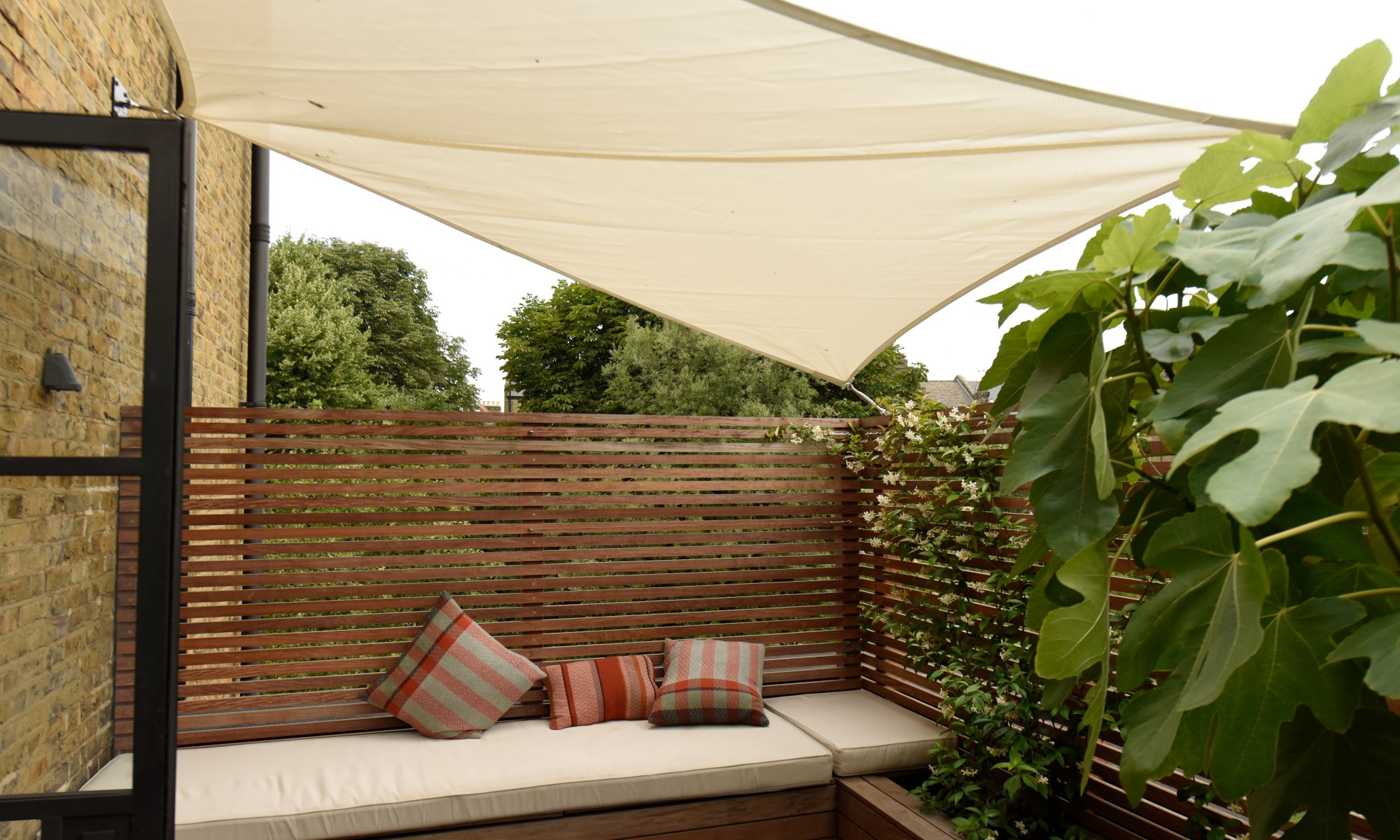 Roof Terrace, Highbury A sleek sun-trap with prairie-style planting providing a sheltered dining area. A sun sail gives further privacy to a built in lounger by the scented Trachelospermum